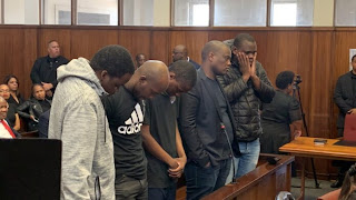 Picture courtesy SABC live braodcast – five alleged suspects in court for the murder of “AKA” and “Tibz”.